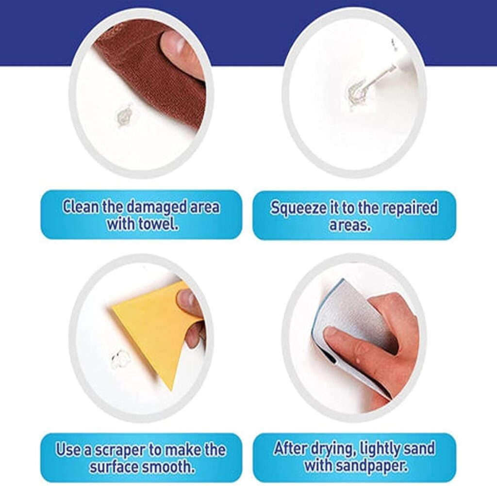 The Wall Mending Paste is a wall repair agent that Instantly fixes dents and cracks on your walls, trim, ceiling and doors; Eliminates holes & deep scratches; Lasts for years with no crumble or flake; Dries fast & holds tight; Easy application with paintability; No specialized skills required & absolutely no mess.